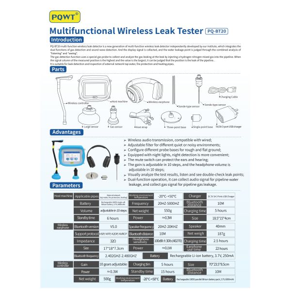 PQ - BT series wireless multifunctional leak detector is a new generation of multifunctional wireless leak detector independently researched and developed by our institute, specifically for detecting pressure pipeline leakage and pipeline direction.